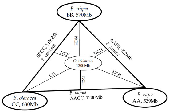 There are certain differences in the cytological behaviors among these nonclassical hybrids, which depend on the genome types of Brassica parents [29] (Figure 3). The different chromosomal behaviors in the hybrids between O. violaceus and three Brassica diploids might be related to their inherent differences in cytology and genome structure. B. oleracea has a genome with a larger size and a higher percentage of repetitive sequences (~60%) than that of B. nigra (~50%) and B. rapa (30%) [13,14,15]. The ~30% larger genome size of B. oleracea than B. rapa is attributable mainly to the continuous TE (Transposable Elements) amplifications during the last four million years since their split [15]. All chromosomes from three diploids during prometaphase in mitosis showed clear heterochromatin segments in the centromere regions and lightly condensed regions at the terminal part of some chromosome arms [30]. At the diakinesis stage of meiosis, the bivalents of B. rapa exhibited highly condensed and deeply stained centromeric regions, less condensed and lightly stained terminal parts, and very clear metacentric and submetacentric centromeres, which could be used to discriminate each bivalent, especially those with satellites [31]. The bivalents of B. nigra also showed highly condensed and deeply stained centromeric regions and terminal parts [32]. In contrast, the bivalents of B. oleracea showed no or slight differentiation of chromatin condensation [31]. Such chromosome morphology of B. rapa and B. oleracea were retained in their allotetraploid B. napus and B. rapa–B. oleracea alien addition lines with additional chromosomes from B. oleracea, which would be the cytological markers for the distinction of the chromosome origin [31,33]. Similar to B. oleracea, O. violaceus showed evenly condensed and stained bivalents [21,22]. Perhaps, it was the similar chromosomal characteristics of B. oleracea and O. violaceus that ensured the coordination of their chromosomes during cell division in their hybrids and no loss of the O. violaceus chromosomes [26,27]. Inversely, the loss of all or partial chromosomes from O. violaceus in the hybrids with B. rapa and B. nigra might be due to their differential chromosomal performance leading to the asynchronous behavior of the parental chromosomes [27]. In addition, the larger genome size of O. violaceus, almost double of the Brassica diploids, may be another reason for the loss of its chromosomes. Due to the interrelationships among six Brassica species, the cytological behaviors of the hybrids between O. violaceus and three Brassica allotetraploids seemed to be explainable from those of the hybrids with three diploids (Figure 3). The hybrids with B. napus (AACC) and B. carinata (BBCC), which shared the C subgenome of B. oleracea, had less difference in chromosome size and staining, while the hybrids with B. juncea (AABB) showed such difference mostly [22,25,26,29]. The unstable cytology in these hybrids also indicated the distant phylogenetical relationships between the two genera.