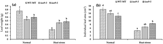 (a) Leaf weight of WT-MT, iaa9-3, and iaa9-5 under normal and heat stress conditions; (b) individual leaf area of WT-MT, iaa9-3, and iaa9-5 under normal and heat stress conditions. The average value ± standard error (SE) (n = 4) followed by the same letter is not significantly different according to the Tukey-HSD test at 5%.