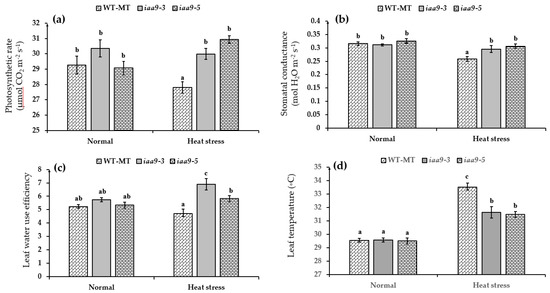 (a) Plant photosynthetic rate of WT-MT, iaa9-3, and iaa9-5 under normal and heat stress conditions; (b) leaf stomatal conductance of WT-MT, iaa9-3, and iaa9-5 under normal and heat stress conditions. (c) Water use efficiency of WT-MT, iaa9-3, and iaa9-5 under normal and heat stress conditions. (d) Leaf temperature of WT-MT, iaa9-3, and iaa9-5 under normal and heat stress conditions. The average value ± standard error (SE) (n = 4) followed by the same letter is not significantly different according to the Tukey-HSD test at 5%.