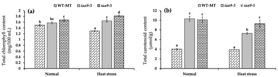 (a) Leaf total chlorophyll content of WT-MT, iaa9-3, and iaa9-5 under normal and heat stress conditions; (b) leaf total carotenoid content of WT-MT, iaa9-3, and iaa9-5 under normal condition and heat stress conditions. The average value ± standard error (SE) (n = 4) followed by the same letter is not significantly different according to the Tukey-HSD test at 5%.