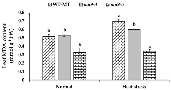 Leaf MDA content of WT-MT, iaa9-3, and iaa9-5 under normal and heat stress conditions. The average value ± standard error (SE) (n = 4) followed by the same letter is not significantly different according to the Tukey-HSD test at 5%.
