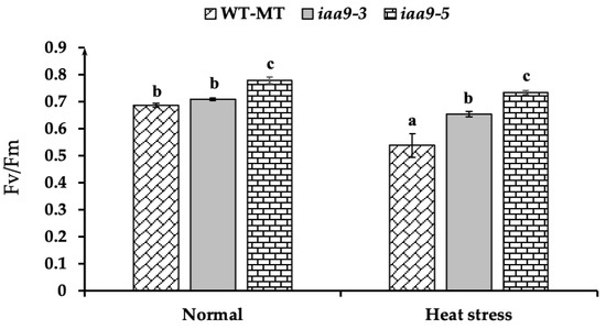 Chlorophyll fluorescence (Fv/Fm) value of WT-MT, iaa9-3, and iaa9-5 under normal and heat stress conditions. The average value ± standard error (SE) (n = 4) followed by the same letter is not significantly different according to the Tukey-HSD test at 5%.