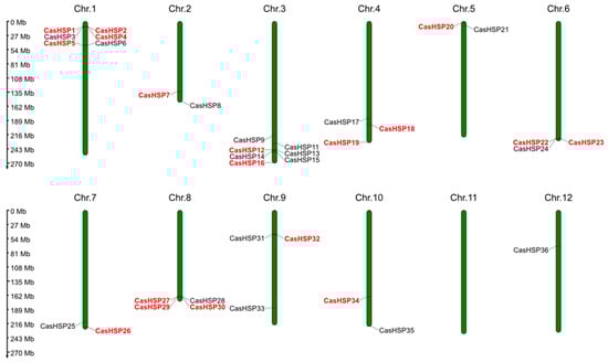 Chromosomal location of the CasHSP genes identified in pepper (Capsicum annuum L.) genome. The approximate locations of the 41 CasHSP genes among the 12 chromosomes are displayed in each chromosome (Chr.1–Chr.12). The distribution of the 19 CasHSP genes specifically detected in the sweet pepper fruit transcriptome is highlighted in red. Chr., chromosome.