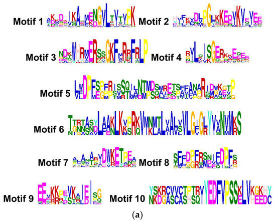 Identification and position of consensus amino acid motifs for pepper CasHSPs. (a) Amino acids motifs. Ten amino acid motifs with various widths were identified. The height of each amino acid symbol is proportional to the degree of conservation in the consensus sequences depicted in the ten motifs. (b) Distribution of conserved motifs. The distribution of conserved motifs, numbers 1–10, of the forty-one pepper sHSPs, are represented by boxes of different colors. Sequence logos of conserved motifs were created by MEME.