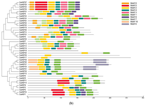 The analysis of the primary structure of the forty-one sHSP proteins revealed a high degree of identity with the families of sHSPs from other plant species, including Arabidopsis, tomato or potato, and allowed discriminating until ten amino acid motifs (Figure 2a). The distribution of these ten conserved motifs in the different CasHSPs from sweet pepper is represented in Figure 2b.