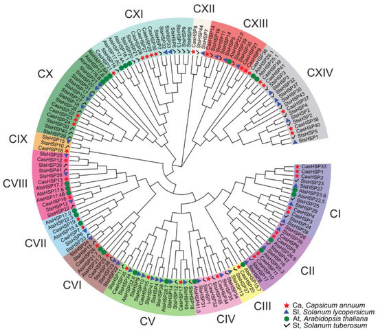 The phylogenetic comparative analysis among the sHSPs from four plant species including sweet pepper (Capsicum annuum), Arabidopsis thaliana, tomato (Solanum lycopersicum), and potato (Solanum tuberosum) allowed the identification of fourteen main sHSP groups, designated as I to XIV and depicted with different colors (Figure 3).