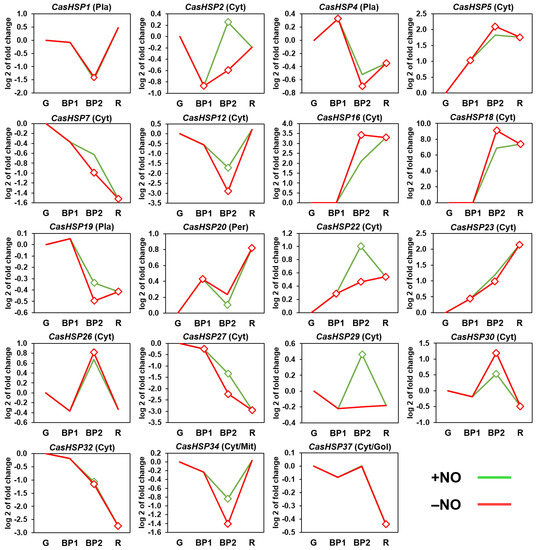 On the other hand, independently of the modulation during ripening, under NO gas treatment at the BP2 stage, some of these genes were also either positive (CasHSP2, CasHSP7, CasHSP12, CasHSP22, CasHSP27, CasHSP29, and CasHSP34), negatively (CasHSP16, CasHSP18, and CasHSP30) or not significantly affected (sHSP1, sHSP4, sHSP5, CasHSP19, CasHSP20, CasHSP23, CasHSP26, CasHSP32, and CasHSP37) by NO treatment. Overall, a total of 10 CasHSP genes were modulated by NO.