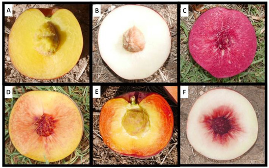 Image of the different flesh color phenotypes identified in the IRTA peach commercial cultivar collection. (A) Yellow flesh (Noracila). (B) White flesh (Nectarnovala). (C) Red flesh (Diablotina). (D) Red dots in the flesh (RDF) (Crispsol). (E) Red dots under the skin (RDS) (Britney Lane). (F) Red color around the stone (CAS) (Lucius).