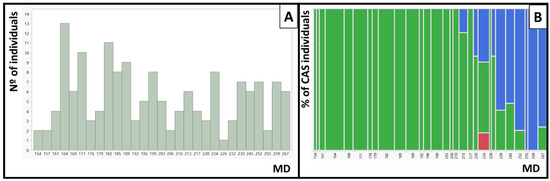 Maturity date (MD) and red color around the stone (CAS) in IRTA’s peach cultivar collection. (A) Distribution of the MD in Julian days. (B) Contingency table between CAS and MD. In green, percentage of individuals with no CAS, and in blue, percentage of individuals with CAS. In red, the Diablotina cultivar that was not phenotyped for CAS.