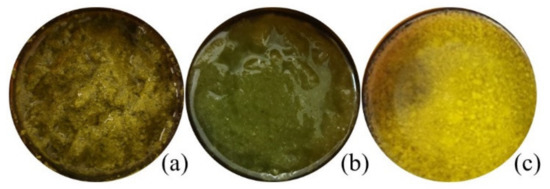 Macroscopic appearance of Matricaria recucita white ray floret supercritical fluid extracts under different combinations of temperature and pressure: (a) sample FAF1, (b) sample FAF2, (c) sample FAF3.