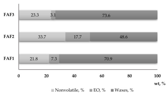 The solubility of obtained CO2 extracts in three different solvents at a concentration of 1:10 (w/v) was determined for testing purposes. It was observed that all CO2 extracts are partly soluble in water and ethanol, whereas they completely dissolve in cyclohexane. These observations are also confirmed by the gravimetrical analysis (Figure 2), which showed that the sum of essential oils (EO) and waxes in the tested CO2 extracts varied from 66.3% (FAF2), 76.72% (FAF1), and 78.17% (FAF3).