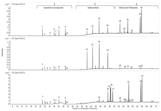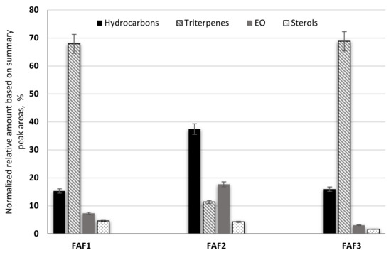 The chemical compositions of the CO2 extracts in cyclohexane were determined according to their retention times and spectrometric electronic library (NIST). The identity of the constituents was established using GC retention indices (RIs). Generally, the chemical composition of CO2 extracts showed the abundance of essential oil components (3.05 –17.7%), hydrocarbons (15.61–59.29%), pentacyclic triterpenes (11.35 –68.79%) and sterols (1.63–4.57%). The presence of essential oil compounds in CO2 extracts was already expected, whereas chamomile (Matricaria recutita) flowers themselves are a rich source of essential oils [22], even when obtained from dried white flower petals. The essential oil typically produced by steam distillation is characterized by its blue color because of the chamazulene present. Chamazulene is not present in the fresh flowers; therefore, in our study, the obtained CO2 extracts exhibited dark yellow (FAF1 and FAF3) and green (FAF2) hues (Table 1), which is consistent with prior findings [13,23,24]. Previous research on the essential oil amount in CO2 extracts showed that it varies between 0.5 and 4.5% [24]. In the framework of the same study, the author indicates the differences in both the amount and content of the essential oil at the different SFE times. Not only the yield but also the essential oil amount increases with pressure (100–120 bar), temperature (30 and 40 °C), and solvent flow rate.