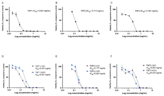 Negative effects on cell viability were also observed in the phototoxicity assay. Viability was rapidly reduced in cells incubated for 1h with extracts without UV irradiation (see Figure 5D–F, -UV samples). Interestingly, for FAF1 and FAF2, viability was slightly higher in UV-irradiated cell cultures compared with cells not exposed to UV. However, the differences were not statistically significant. An explanation for this might be the antioxidative activity of the extracts, which complement cellular antioxidative defense mechanisms induced by UV exposure.