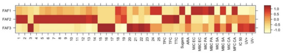 The data obtained in Figure 6 illustrate obvious differences among all three investigated supercritical extracts and confirms the hypothesis that even small changes in the Matricaria recutita processing by-product white ray florets supercritical extraction parameters (such as temperature and pressure) can affect not only the yield but also the chemical composition, which in turn affects the further properties of the extracts. The extract with the smallest total extraction yield (FAF2) showed the highest concentration of total phenolics (TPC), flavonoids (TFC), and tannins (TTC), which in turn reflected on the increased antiradical activity (ARA) of the extract. However, the values of other parameters such as cytotoxicity and phototoxicity were higher for FAF3 extracts, suggesting that the values of these parameters are influenced by some individual hydrocarbons (15–17) and triterpenes (20–23). According to antimicrobial activity, the best results were extrapolated from extract FAF1. The highest inhibitory and bactericidal activity of FAF1 against E. coli (MIC EC and MBC EC) could be attributed to the highest β-amyrin (25) content among tested extracts, as well as the presence of high total sugar concentrations.