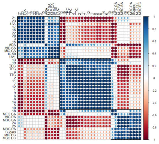 To verify the strength of the association between several variables, a correlogram was constructed (Figure 7). Previous descriptions of strong correlations of cytotoxicity (IC 50) and phototoxicity (UV− and UV+) among some individual hydrocarbons (15–17) and lupeol and taraxerol type-triterpenes (20–23), as well as inhibitory effects against S. aureus (MIC SA) and C. albicans (MIC CA), were confirmed by the obtained correlogram. The matrix also allows for the assessment of the relationships between detected α- and β-amyrin (24 and 25) and inhibitory against S. aureus (MBC SA) and P. aeruginosa (MIC PA). Total sugars were highly positively correlated with inhibitory against P. aeruginosa (MBC PA) and E. coli (MIC EC and MBC EC), with a weaker influence on inhibitory against S. aureus (MBC SA) and P. aeruginosa (MIC PA). Matrix correlation supports the role of sterols (18 and 19) on inhibitory activity against yeasts, including C. albicans (MFC CA). Strong negative correlations between essential oil compounds (1–10) and almost all tested variables, except antiradical activity (ARA), were also confirmed.