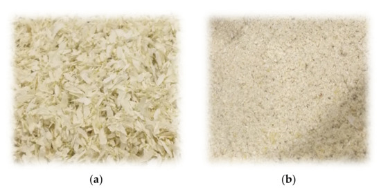 Matricaria recutita white ray florets before (a) and after (b) milling used for supercritical fluid extraction.