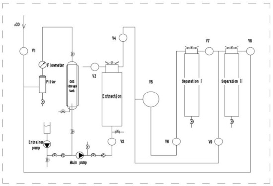 Supercritical fluid extraction was carried out with a pilot-scale supercritical fluid extractor, the CAREDDI SCFE-5L (UAB Analytical Solutions; Kaunas, Lithuania), using carbon dioxide (CO2) and ethanol (EtOH) as co-solvents. The supercritical extraction unit consisted of a high-pressure CO2 pump, a co-solvent pump, a cooling system, a heating system, a temperature control system, a CO2 storage tank, a 5 L extraction tank, and two-stage separation tanks (4 L and 2 L). The process diagram is depicted in Figure 9.