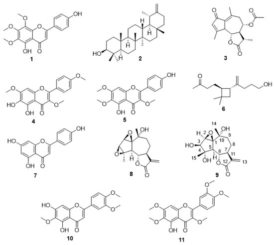 - Liu, Y.L.; Mabry, T.J. Sesquiterpene lactones from Artemisia frigida. J. Nat. Prod. 1981, 44, 722–728. [Google Scholar] [CrossRef]