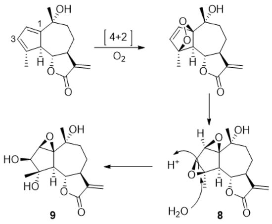 - Begley, M.J.; Hewlett, M.J.; Knight, D.W. Revised structures for guaianolide α-methylenebutyro-lactones from feverfew. Phytochemistry 1989, 28, 940–943. [Google Scholar] [CrossRef]