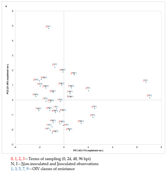 To analyse the total variability of the volatile compounds’ absolute peak area related to the division of the OIV resistance classes (1, 3, 5, 7, and 9), terms of sampling (0, 24, 48, and 96 hpi), and treatments (considering non-inoculated and inoculated samples), a principal component analysis (PCA) was performed using all detected VOCs and using each group of detected volatile compounds separately. Most groups of compounds did not contribute to a distinct separation of the samples by any of the aforementioned factors (data not shown). However, the PCA based on the APA of individual sesquiterpenes contributed the most to distinguishing the OIV classes of resistance. In particular, the PCA scatter plot of the first two components explained 64.59% of the variability (Figure 2) with the first principal component (PC1) accounting for 43.11% and the second (PC2) for 21.48%. The projection on these two axes distinguished the two highly resistant genotypes (OIV classes 7 and 9) from V. vinifera genotypes (OIV classes 1, 3, and 5). However, in OIV classes 1, 3, and 5, terms and treatments were not clearly separated (Figure 2a).