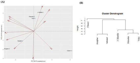 PC2 explained 34.8% and was associated with shoot trait and root angle the same as under control conditions (Figure 3A). J. Khetifa with Vulci was assigned on the PC2 positive side, Azeghar and Sebatel on the negative, and Cham1 with Pelsodur were close to zero value. According to hierarchical analysis, all genotypes were distinguished into two major clusters, where Sebatel and Azeghar were assigned together with the salt-tolerant J. Khetifa to one cluster, and Vulci, Pelsodur, Cham1 were grouped to the second one (Figure 3B).