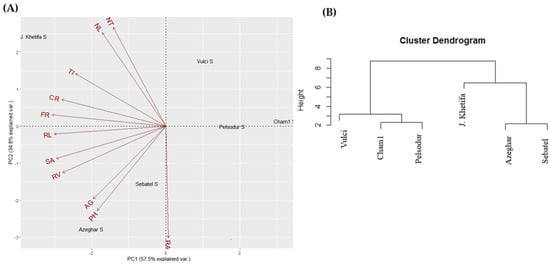 Biplot of the principal component analysis (A) and hierarchical analysis (B) of the shoot and root traits under control conditions. For abbreviations, please see the abbreviation list at the end of the paper.