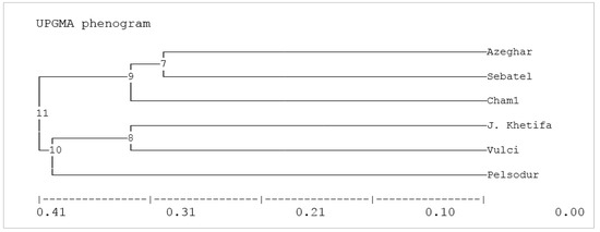 The observed heterozygosity was zero for most of the markers. Nevertheless, despite working with a self-pollinated species, the observed heterozygosity was not always equal to zero. Some markers detected high observed heterozygosity (i.e., wmc727a, wms205, and gwm573.2). Regarding the heterozygosity of wms205, it should be noted that all six genotypes have the same allelic situation leaving a suspect of a non-perfect allelic situation among the two detected bands common for all the genotypes. The gene diversity, computed as expected heterozygosity (He), and the polymorphism information content (PIC) provides information on a marker’s ability to determine polymorphism. In the present study, the gene diversity is quite high, ranging from 0.278 (gwm234a and wmc727b, which are second loci detected by an SSR marker) to 0.778 (cfa2086) (Table 4). The PIC values had a similar but not equal ranking among markers compared with the gene diversity parameter. PIC ranged from 0.24 for gwm234a and wmc727b to 0.74 for cfa2086 (Table 4). The Shannon Information Index (Table 4) indicates richness, and the evenness is always quite high ranging from 0.45 to 1.56, with an average of 1.01. The polymorphism among the different genotypes was not dramatically different; it ranged from about 13% in Pelsodur to about 27% in Azeghar and Sebatel, with an average of 21% (data not shown). Interestingly the number of Private alleles, i.e., alleles present only for a single genotype, is quite high (Table 5). All the genotypes have at least one allele present only in those genotypes. This goes from Vulci with one private allele to Azeghar and Pelsodur with four private alleles. Not surprisingly, cfa2086, with the higher PIC, also has a higher number of private alleles detected.