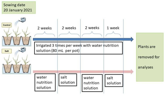 A pot experiment was performed in a greenhouse at Tuscia University’s experimental farm (Viterbo, Italy) from January to February 2021. A Randomized Complete Block Design (RCBD) with three replications, six genotypes, and two salinity levels was used. The six genotypes were sown with one seed per pot placed with the embryo facing down on 20 January 2021. Each pot was 17 cm (diameter) by 16 cm (high) and filled with 2.5 L of sand (Figure S1). The temperature in the greenhouse was constantly maintained at around 25 °C during the day and around 15 °C during the night to have optimum growing conditions. Before starting the treatments, all pots (control and salinity treatment) were irrigated, using a dropping pipe, three times per week (80 mL/per pot) with a water nutrition solution composed of dihydrogen phosphate potassium (0.13 g/L), potassium sulfate (0.04 g/L), nitric acid (0.286 mL/L), calcium nitrate (0.432 g/L), potassium nitrate (0.436 g/L), magnesium nitrate (0.244 g/L) and Micron (0.23 g/L) [25]. Two weeks after sowing, when all seedlings reached two fully expanded leaves stage, plants under salinity treatment were started treated with a salt solution (250 mM NaCl) 3 times per week (80 mL/per pot) for 14 days, while the ones under control treatment were irrigated with the same solution but without NaCl. After two weeks of salt treatment, pots were watered with a water nutrition solution without salt for 14 days. After two weeks (no NaCl), for a week, the salt solution was applied again, and after that, the plants were removed for analysis (Figure 5).