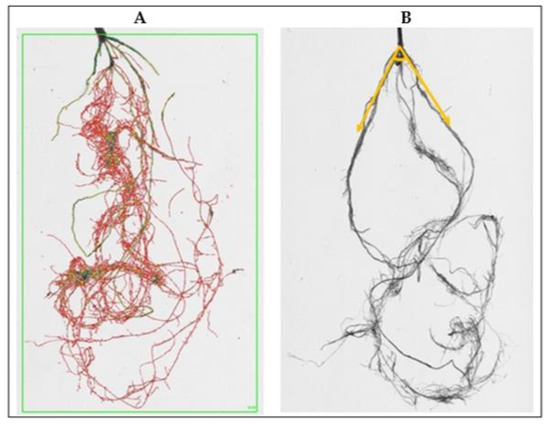 Plants for analysis were collected after 7 weeks after sowing in total. Roots were carefully washed to remove the sand, using a soft spray watering head, and analyzed using Win-RHIZO Pro software v2009 (version 4.0b; Regent Instruments, Montreal, QC, Canada). The morphological traits of the roots were recorded for the whole root system (Figure 6A), such as total root length (RL), the sum of all roots lengths, cm, surface area (SA), total root surface area, cm2, root volume (RV), total root volume, cm3, number of tips (TI), forks (FR), and crossings (CR). The root angle (RA, degree on the vertical °) between the two extreme sides of the roots with the center set in the middle of the crown was measured using the software ImageJ, which could be freely download at https://imagej.nih.gov/ij/download.html; accessed on 13 January 2023 (Figure 6B). Morphological traits for shoots, such as plant height, number of leaves, and number of tillers, were also recorded.
