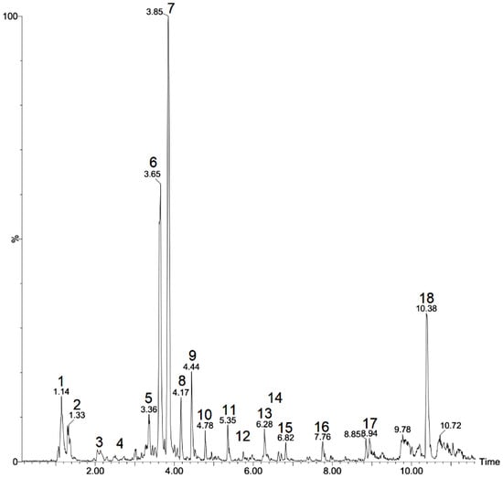 - Abu-Reidah, I.M.; Contreras, M.M.; Arráez-Román, D.; Segura-Carretero, A.; Fernández-Gutiérrez, A. Reversed-Phase Ultra-High-Performance Liquid Chromatography Coupled to Electrospray Ionization-Quadrupole-Time-of-Flight Mass Spectrometry as a Powerful Tool for Metabolic Profiling of Vegetables: Lactuca sativa as an Example of Its Application. J. Chromatogr. A 2013, 1313, 212–227. [Google Scholar] [CrossRef]