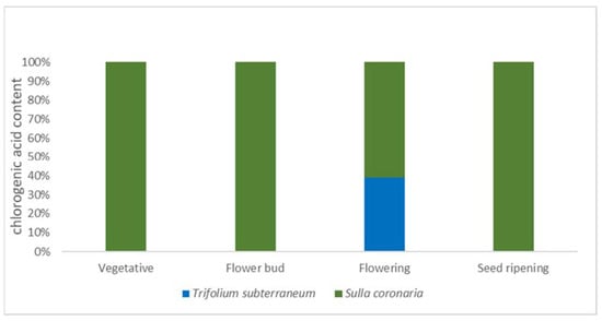 Forage plants represent a rich and interesting source of bioactive compounds that are specific to each forage species []. However, when considering the common individual phenolic compounds, namely, chlorogenic and cryptochlorogenic acids, hydroxycinnamic acid derivatives, and quercetin 3-glucoside (Table 6 and Table 7), our findings indicate that their contents widely differed according to species and growth stages.