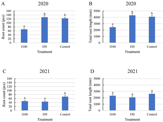 Contrarily, the 2021 findings regarding vertical root distribution deviated from the 2020 results (Figure 5). In general, the deeper the soil layer was, the more and longer roots were developed, and the highest counts were observed in the control treatment in the 50–70 cm layer, represented by 85 roots with a total length of 3355 mm in 2021. However, the total length of roots was the lowest in the I50 treatment in the 10–30 cm layer (1272 mm), and the number of roots was equally low in the irrigated treatments in this layer (35 pcs). Comparing the number and length of roots, the data revealed that the plants in the control group developed significantly more roots in each layer compared to the irrigated treatments due to severe water stress. The results for the I50 treatment were inconsistent in the two growing seasons since the same level of root number was detected as in the I100 treatment; however, the detected roots in the 10–30 cm layer were shorter for the I50 treatment compared to the I100 treatment. This discrepancy was most remarkable in the middle layer of the I50-treated group between the two years. Additionally, the statistical analysis also showed that there is no significant interaction between treatment and layer, meaning that the impact of the water treatment on root count and total root length seems to be similar across different soil layers.
