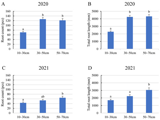 Average root count and total root length in different soil layers. (A) Average root count in 2020, (B) total root length in 2020, (C) average root count in 2021, (D) total root length in 2021. Error bars represent SD. Different letters indicate statistically significant difference at p < 0.05 level.