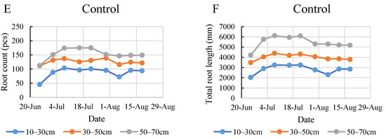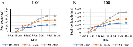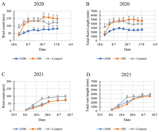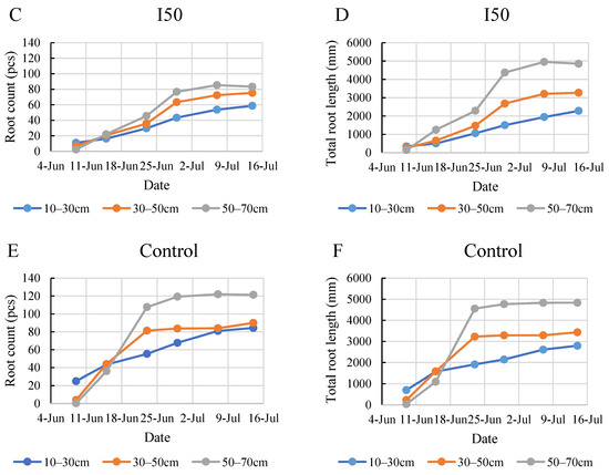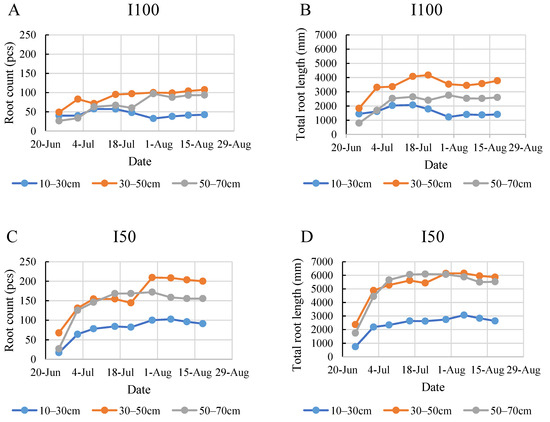 According to the data in Figure 6, the top layer developed fewer roots under all treatments, except for the I100 treatment at the beginning of the monitoring period in the 2020 growing season. The maximum count of 104 roots in the 10–30 cm layer was found in the control group on 8 July. By the end of the monitoring period, it was found that the full irrigation treatment produced the most dense roots in the middle layer, expressed mostly in the total root length (Figure 6A,B). These graphs indicate that during the intensive root development period between 25 June and 8 July, the plants under full irrigation developed shorter root systems compared to the plants under severe and mild stress treatments. Under the mild stress treatment, the plants in the middle and bottom layers developed roots of nearly the same length throughout the entire monitoring period. The increment in root count was continuous and consistent until a later date of 30 July for the I50 treatment compared to the control and the I100 treatment, where root count stagnated after the intensive development period and even showed a decrease later in the monitoring period, especially in the control. The biggest growth in root count during the 2020 monitoring period was recorded in the 50–70 cm layer for the I50 treatment when the number of roots increased by 460% during one week (Figure 6C).