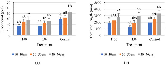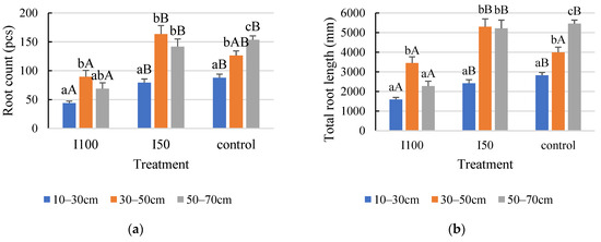 Effect of different water supply on root count (a) and total root length (b) between different soil layers in 2021. Error bars represent SD. Different capital letters above the columns represent statistical differences caused by different water supply within the same layer, while lowercase letters express differences within the same treatment between soil layers at p < 0.05 level.