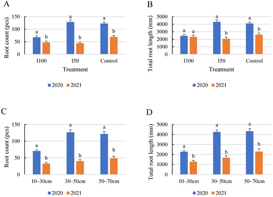 Comparison of average root count (A,C) and the average of total root length (B,D) under the different treatments (A,B) and in different soil layers (C,D) for the 2 growing seasons. Error bars represent SD. Different letters indicate statistically significant difference growing seasons at p < 0.05 level.