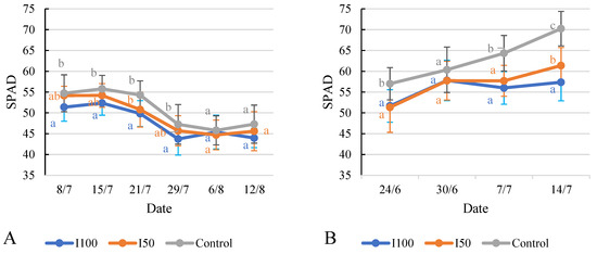 Evolution of chlorophyll content (SPAD) under different water supply treatment. (A) Evolution in 2020, (B) evolution in 2021. Error bars represent SD. Different letters indicate statistically significant difference at p < 0.05 level.