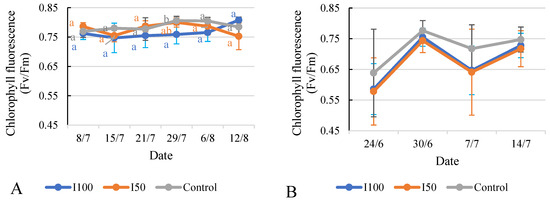 Evolution of chlorophyll fluorescence under different treatments in 2020 (A) and in 2021 (B). Error bars represent SD. Different letters indicate statistically significant difference at p < 0.05 level.