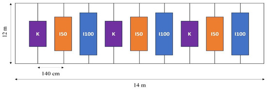Clean irrigation water was supplied through a drip irrigation system. Three distinct treatments were implemented, supplying 100% of crop evapotranspiration (I100), 50% of I100 (I50), and a non-irrigated control (K). Each treatment was replicated thrice to ensure the robustness of our data. As depicted in Figure 11, the experimental design ensured an even application of the different treatments. The I100 treatment received 241 mm of water, the I50 received 201 mm, and the non-irrigated K received 159 mm during the monitoring period of the first growing season. The crop evapotranspiration was 231 mm, averaging 4.2 mm per day in 2020. In 2021, the total water supplies for the I100, I50, and K treatments were 206 mm, 129 mm, and 51 mm, respectively, with 180 mm evapotranspiration, averaging 5 mm per day during the monitoring period. These data indicate that the 2021 observations occurred during a drier period.