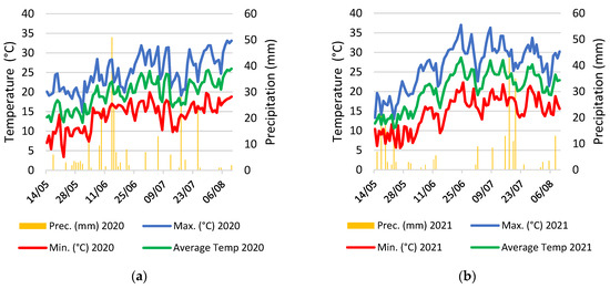 Temperature and precipitation in the 2020 (a) and in the 2021 (b) growing seasons.