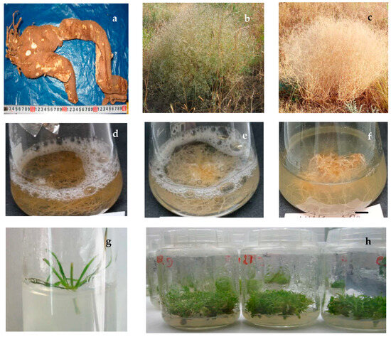 Allochrusa gypsophiloides: (a) wild-grown root from native site; (b) wild flowering plant; (c) bust “tumble-weed”; (d) in vitro adventitious root (AR) culture in liquid ½ Murashige and Skoog medium (MS) free from growth regulators (control) 45th day of culture; (e) in vitro AR culture in ½ MS with indolyl-3-butyric acid (IBA) 1 mg/L 45th day of culture; (f) in vitro AR culture in ½ MS with α-naphthalene acetic acid (NAA) 1 mg/L 45th day of culture; (g) initial node explant on MS medium with 1 mg/L kinetin and 0.5 mg/L NAA, 5th day of culture; (h) in vitro adventitious shoots (ASs) on MS without growth regulators, a month culture, 2nd passage.
