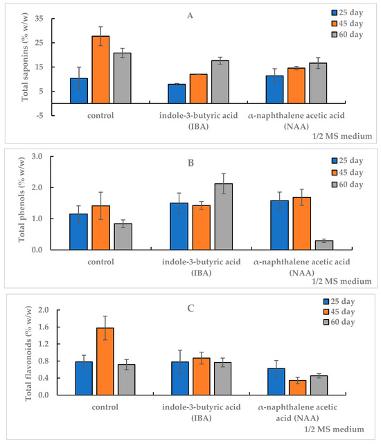 The growth-stimulating effect of auxins on AR biomass increase has been established for different species. A high saponin level of 29.5 mg/g crude weight was detected in a Primula veris root culture on an inducing medium with auxin in combination with kinetin [51]. In the in vitro culture of Gypsophilla ssp. roots, the accumulation of saponins varied from a minimum, 7 mg/g, to a maximum level, 65 mg/g, depending on the original root line [31]. In the work of M. Simao et al. [49], the effectiveness of NAA action on the proliferative activity of adventitious roots of Passifflora pohlii Mast is shown.
