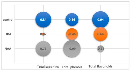 To reveal the relationship between AR biomass growth and accumulation of secondary metabolites during cultivation on control and auxin-containing medium variants, a correlation analysis was performed (Figure 4).