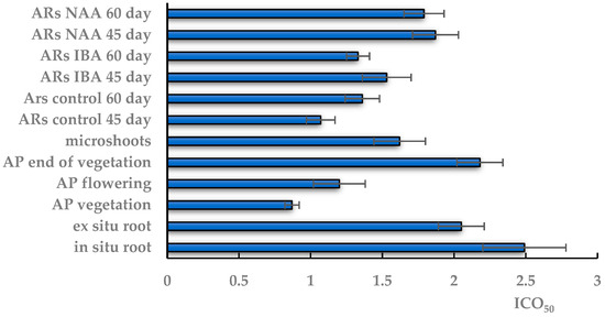 Antioxidant activity of TSR extracts obtained from in situ and ex situ roots; the aerial part (AP) of wild-grown plants during vegetation, flowering and at the end of vegetation; in vitro microshoots; in vitro adventitious root (AR) culture on the 45th and 60th days of cultivation on control and experimental variants of ½ MS medium with indole-3-butyric acid (IBA) or α-naphthalene acetic acid (NAA). ICO50—the concentration required to inhibit 50% of the DPPH radical formation. The data are presented as means ± standard error (SE).