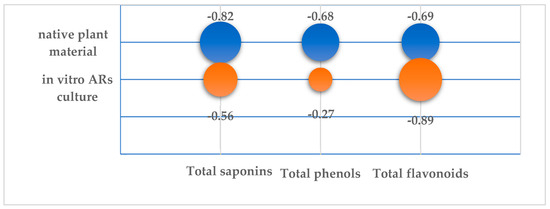 The correlation analysis on the AOA of extracts (ICO50) and the content of SM in the extracts showed a different nature of the relationship between the indicators in native raw materials and the in vitro AR culture (Figure 7).