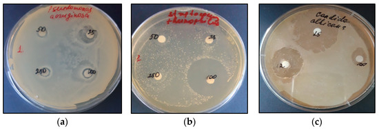 Growth-inhibiting activity of the control extracts of an in vitro AR culture of TSR in relation to: P. aeruginosa, zone 5 mm at 25 μL (a); S. thermophilus, 18 mm at 100 µL (b); inhibitory zone of 16.2 mm of commercial saponin from Quillaja bark (1:1) at 25 µL in a culture of C. albicans (c).