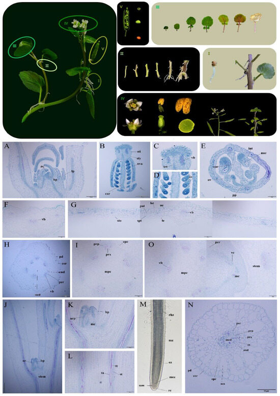 Paraffin sectioning of watercress. (I) Two types of watercress roots. (II) Watercress stems. (III) Watercress leaves. (IV) Organ structure and growing points of watercress. (V) Development of watercress seeds. (A) Growing point. (B–E) Pistil. (F) Cross section of petiole. (G) Longitudinal section of petiole. (H,I) Cross section of stem. (J–L) Longitudinal section of stem. (M) Root. (N) Cross section of root. (O) Cross section of stem node. pd Epidermal cell. bp Bud primordium. lp Leaf primordium. mc Meristematic cell. vb Vascular bundle. pc Parenchyma cell. ta Annular vessel. tt Spiral vessel. st Sieve tube. prb Primary root primordium. ar Adventitious root. vc Vascular cambium. sty Style. sti Stigma. pi Pistil. ova Ovary. int Integument. nuc Nucellus. car Carpellary wall. ov Ovule. trt Central transmitting tissue. pp Parietal placentation. sto Stoma. spt Spongy tissue. pat Palisade tissue. ke Cuticle. ue Upper epidermis. le Lower epidermis. cor Cortex. end Endodermis. epc Epidermal cell of cortex. per Pericycle. med Medulla. mpc Medullary parenchyma cell. prp Primary phloem. prx Primary xylem. stem Stem node. rhz Root hair zone. mz Maturation zone. ez Elongation zone. mez Meristematic zone. rc Root cap. sam Shoot apical meristem. cs Casparian strip. acs Air cavity structure.