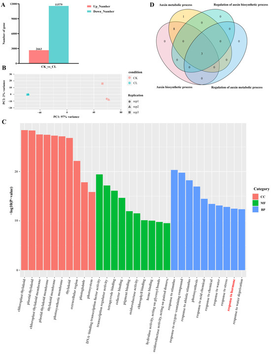 Transcriptome analysis of root. (A) A number of DEGs in the transcriptome. (B) PCA analysis for each sample in the transcriptome. (C) GO enrichment analysis of differentially up-regulated genes. (D) Venn diagram of the genes associated with GO terms related to auxin metabolism.
