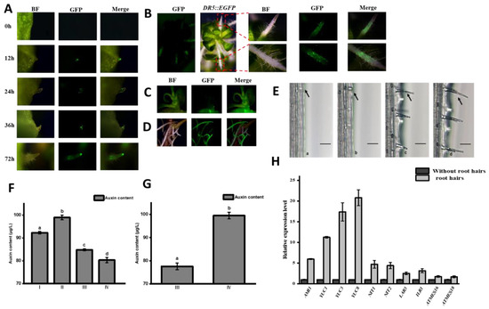 DR5::EGFP transgenic watercress was cultured in a Murashige and Skoog (MS) medium containing 0.2 M of PEG to simulate a drought environment, and the GFP fluorescence signal of the DR5::EGFP watercress root development was tracked and observed. It was found that there was no GFP fluorescence signal when the root primordium cells were not formed in the central cylinder cells of the stem, but at 12h, when the root primordium emerged through the epidermal cells of the stem to form a young root, the GFP fluorescence signal in the root tip meristem was strong; after 24 h of young root growth, the GFP fluorescence signal in the root tip meristem weakened, and the GFP fluorescence signal appeared at the edge of the elongation zone; at 36 h of root growth, the GFP fluorescence signal in the root tip meristem was weak, but some were concentrated in the root meristem; and at 72 h, when the root hair sprouted in the root maturation zone, the GFP fluorescence signal was still weak but distributed in the root hair zone (Figure 3A). Root hair development has four stages: first, the differentiation of the root epidermal cells to form the H cell (a); second, the H cell forms a hair-like structure (b); third, it protrudes and elongates to form the rudiment of the root hair (c); finally, the root hair develops and matures (d). Drought treatment inhibits the growth of watercress and promotes the growth of a large number of root hairs in the upright stem. The root length becomes shorter, and a large amount of GFP fluorescence signal is concentrated in the root hair area (Figure 3B). When watercress is grown in a hydroponic environment, the upright part of the root continues to elongate, and the entire root has a strong GFP fluorescence signal during elongation (Figure 3C). These findings indicate that auxin is involved in the entire process of root and root hair development in watercress.