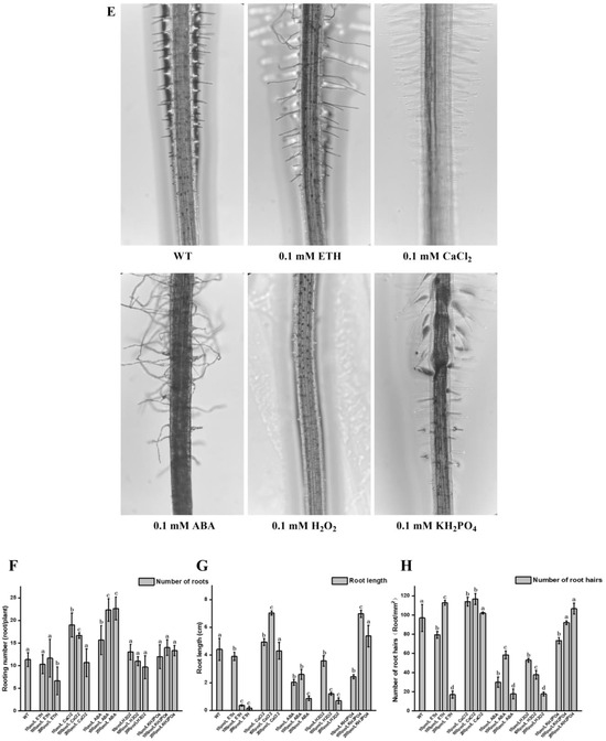 Effects of different treatments on the development of watercress roots. (A) Effects of IAA, BBO, and NPA on root system development. (B) Effects of IAA, BBO, and NPA on root formation. (C) Effects of IAA, BBO, and NPA on root length. (D) Effects of IAA, BBO, and NPA on root hair development. (E) Effects of ETH, CaCl2, ABA, H2O2, and KH2PO4 on root system development. (F) Effects of ETH, CaCl2, ABA, H2O2, and KH2PO4 on root formation. (G) Effects of ETH, CaCl2, ABA, H2O2, and KH2PO4 on root length. (H) Effects of ETH, CaCl2, ABA, H2O2, and KH2PO4 on root hair development. All the bars indicate mean ± SD. Letters indicate significant difference analysis (p < 0.05, Student’s t-test).